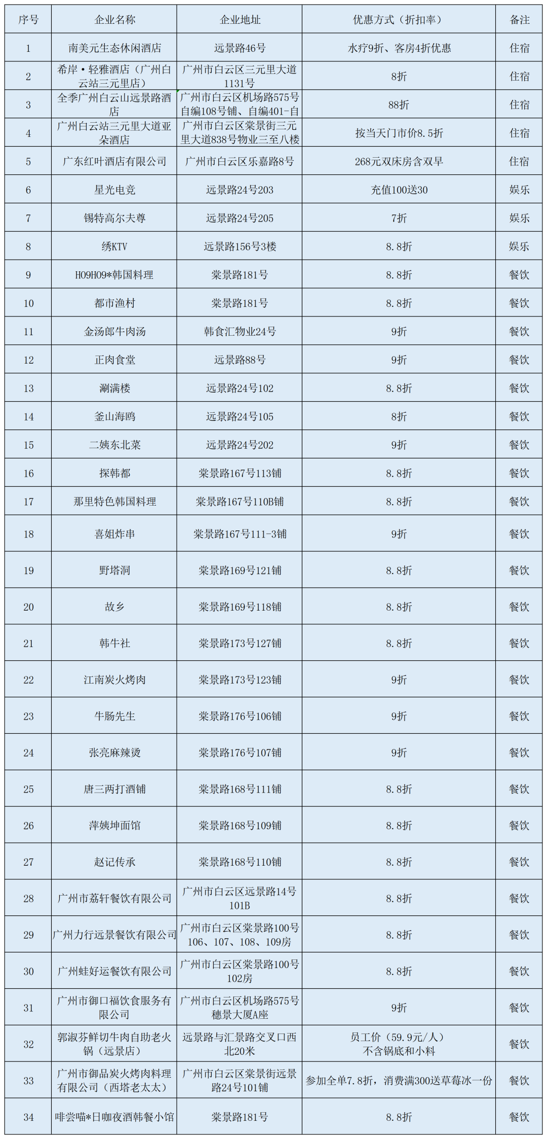 享受优惠:消费时出示到广州白云站两天内的车票(例:15日到达白云站,15、16日均可使用),即可享受对应优惠